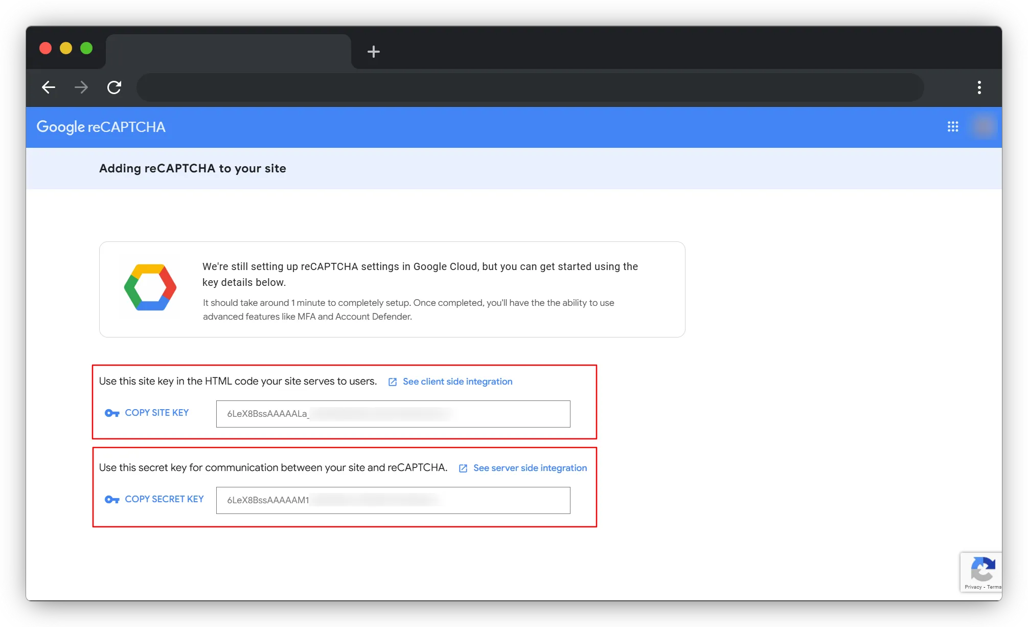 - Set up free reCAPTCHA keys from Google